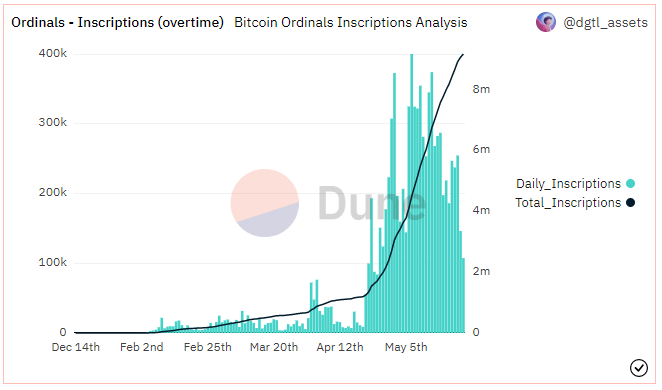 Al momento de la publicación, hay más de 9,18 millones de inscripciones de Ordinals, las cuales han generado aproximadamente 40 millones de dólares en tarifas, según Dune Analytics.