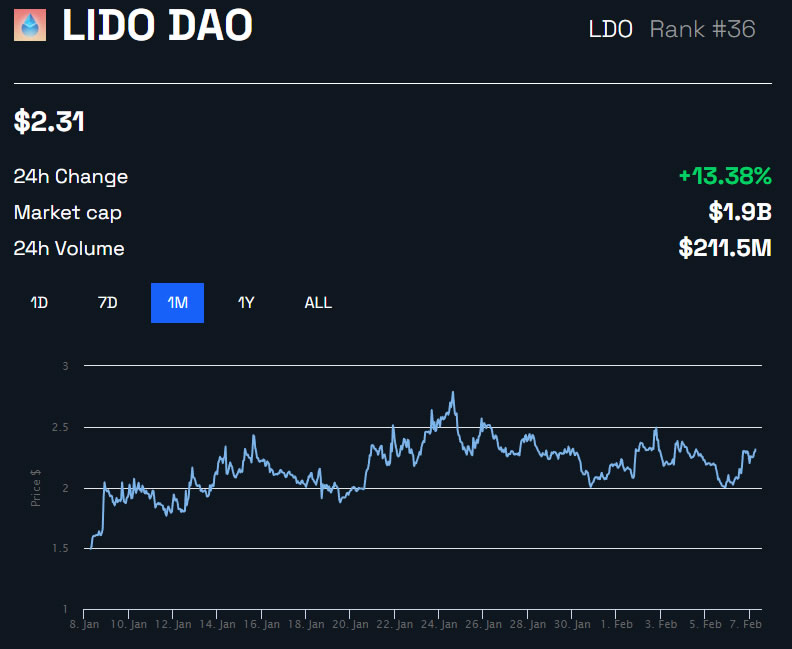 Además, el token de gobernanza de liquid staking ha aumentado un 58% durante el último mes. Sin embargo, permanece un 68.3% por debajo de su pico de 7.30 dólares registrado en agosto de 2021.