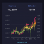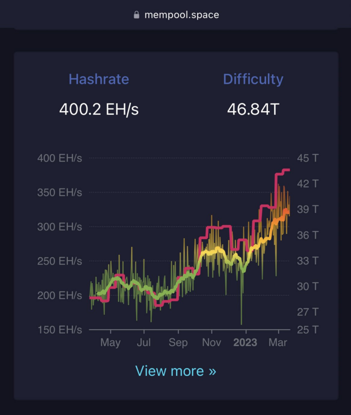 En el momento de la publicación, el hashrate de la red BTC registra un ATH de 400 EH/s con una dificultad récord de 46.84 T.