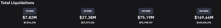 La caída en el precio de las criptomonedas en las últimas 24 horas ha ocasionado 169 millones de dólares en liquidaciones para los traders, según datos de Coinglass.
