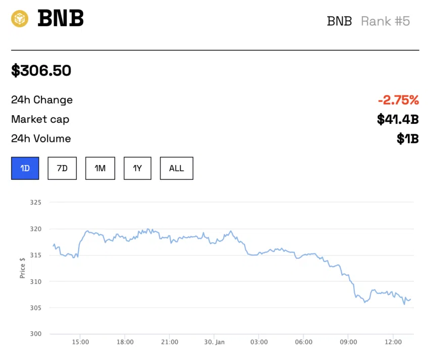 A pesar de la importancia del anuncio, el precio de Binance Coin (BNB) no ha reaccionado positivamente. En las últimas horas, BNB experimentó una fuerte corrección del 5,27%, alcanzando un mínimo intradiario de 304,30 dólares.