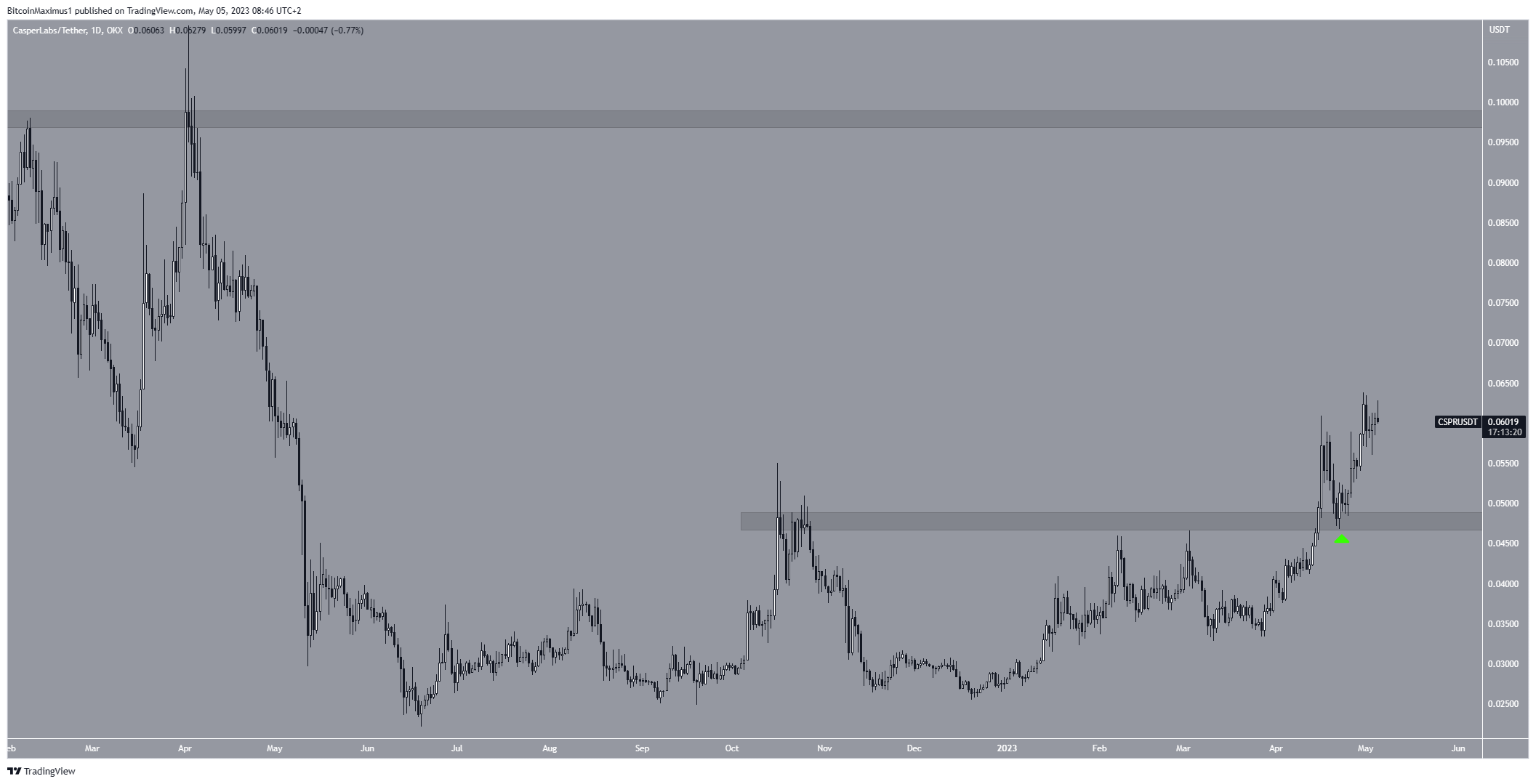 El precio de CSPR ha aumentado desde que rebotó en el área de resistencia horizontal de 0.047 dólares, lo que a su vez validó como soporte (icono verde). La ruptura condujo a un nuevo máximo anual de 0.064 dólares el 30 de abril.