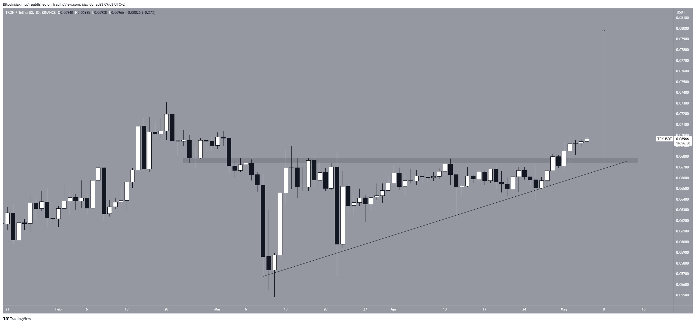 El precio de TRX ha aumentado junto con una línea de soporte ascendente desde el 10 de marzo. Cuando se combina con el área horizontal de 0.068 dólares, se crea un triángulo ascendente, considerado un patrón alcista.