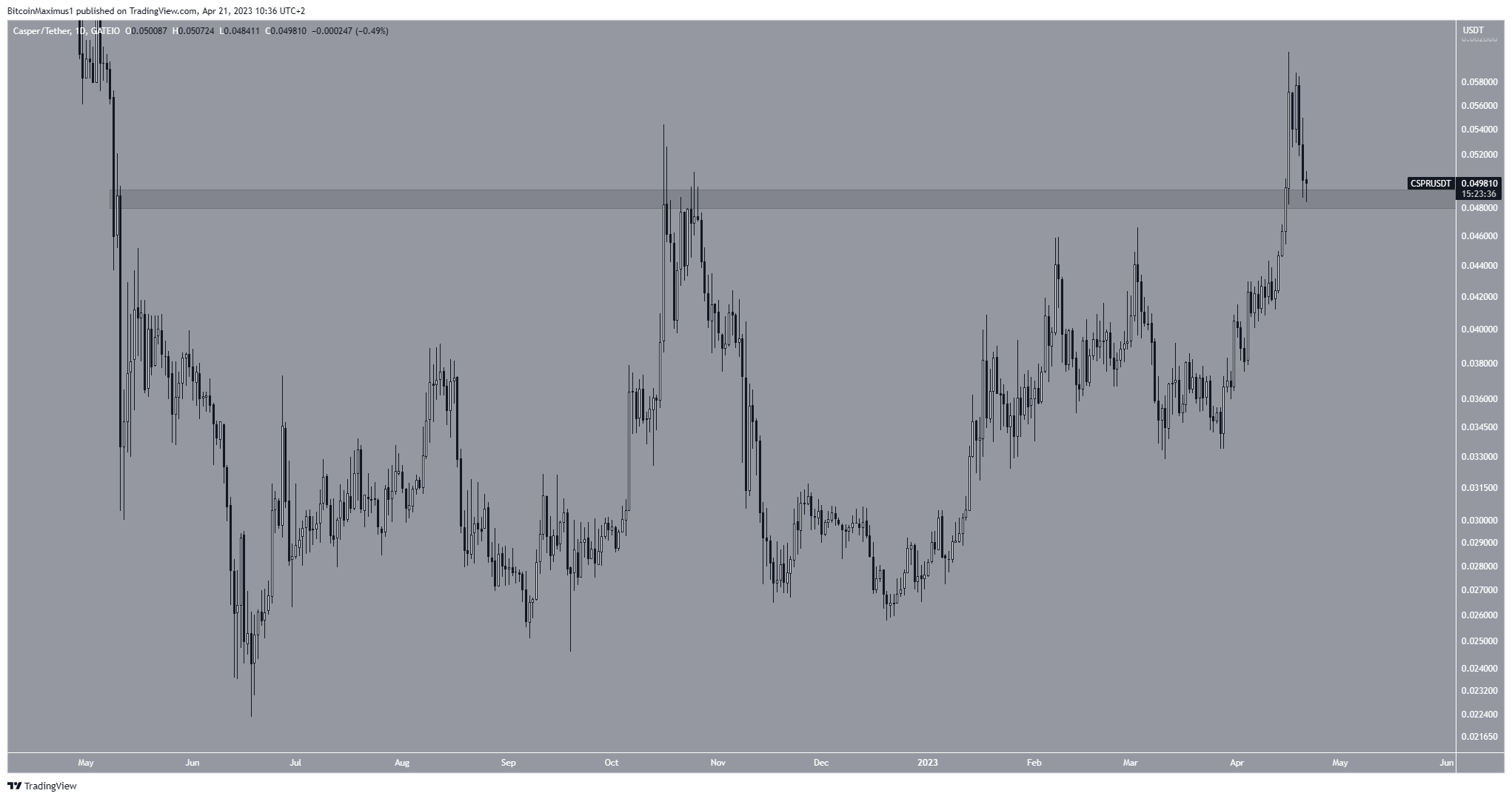 De manera similar a RNDR, el precio de CSPR ha caído desde que alcanzó un nuevo máximo anual de 0.060 dólares el 16 de abril. Actualmente, el precio se negocia dentro del área de soporte horizontal de 0.049 dólares.
