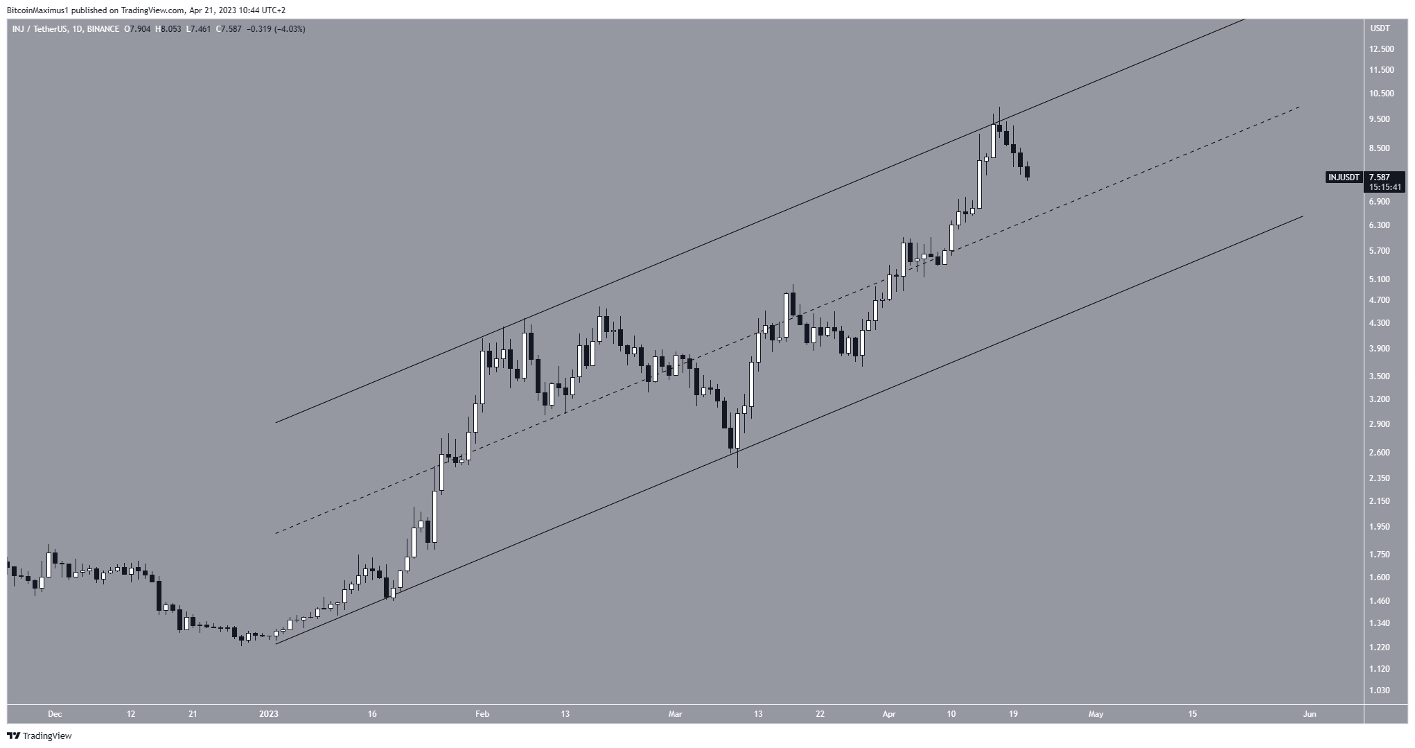 El precio de INJ ha sido una altcoin alcista desde principios de año. Durante este tiempo, aumentó dentro de un canal paralelo ascendente.