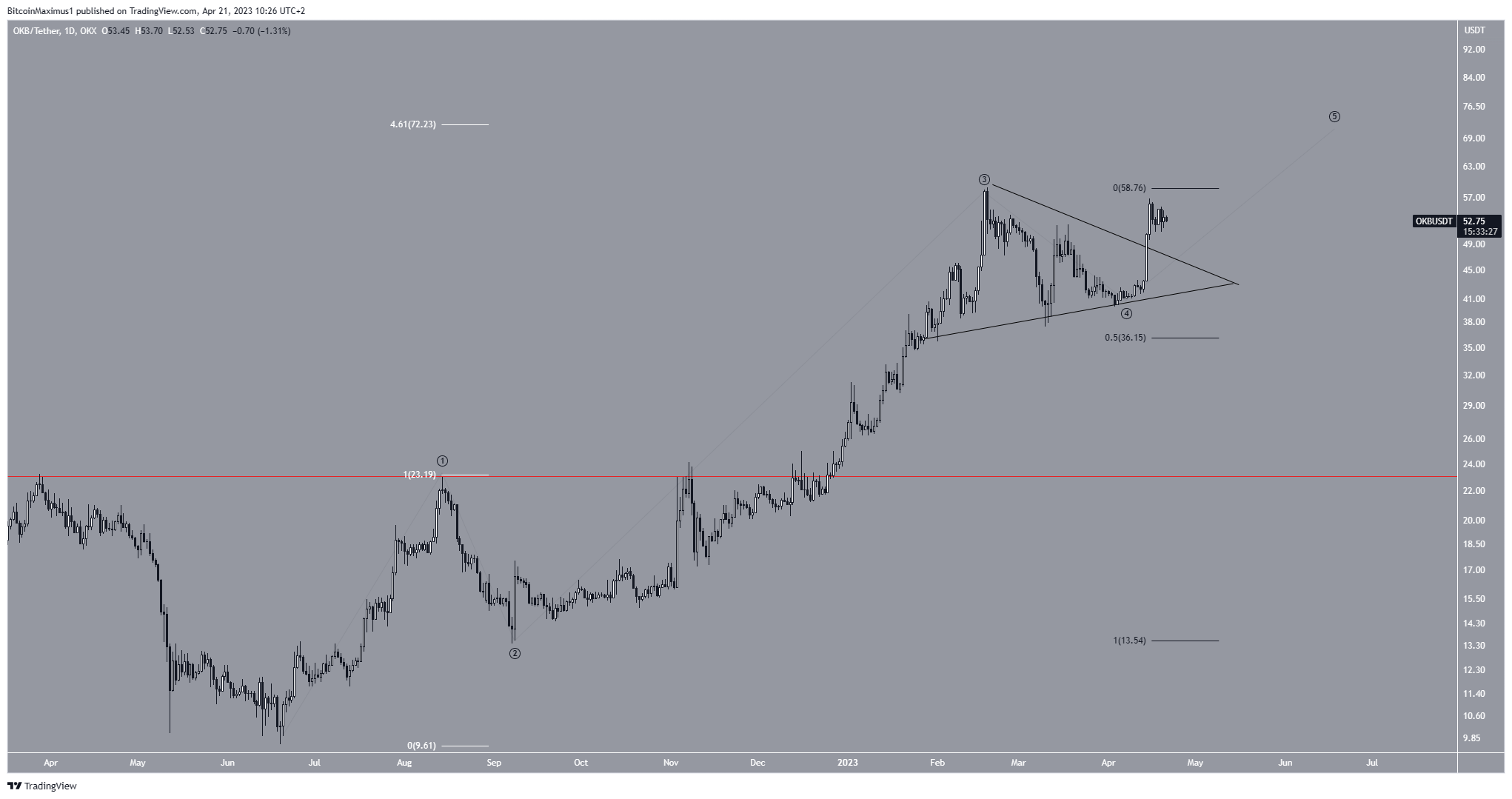 Tras una breve caída, el precio rompió un triángulo simétrico el 14 de abril. Es posible que OKB se encuentre ahora en la quinta y última onda de un movimiento alcista. Si es así, podría alcanzar un máximo cercano a los 72.23 dólares.