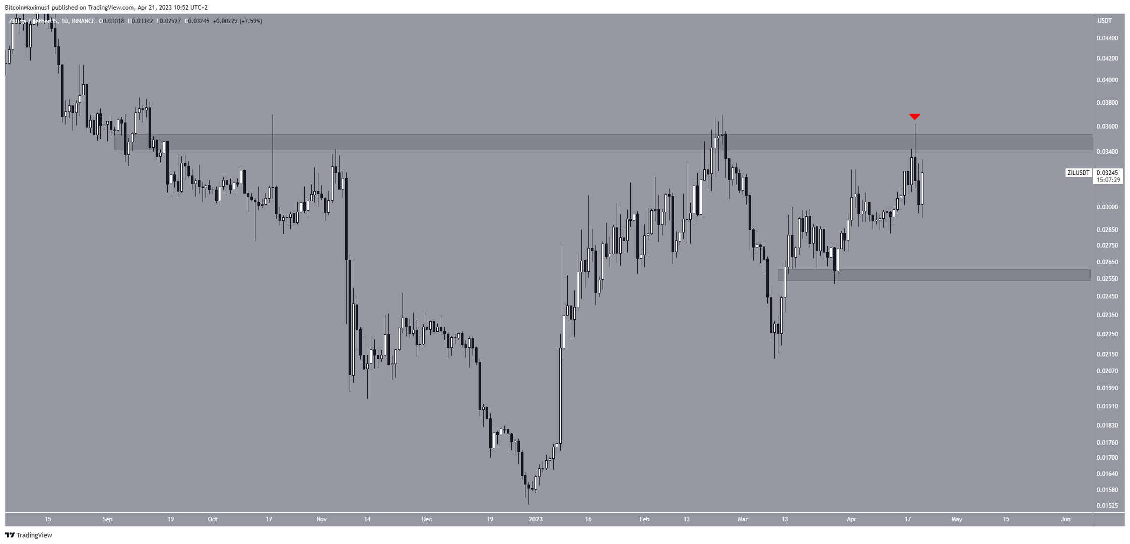 El precio de ZIL ha caído desde que fue rechazado por el área de resistencia horizontal de 0.035 dólares el 19 de abril (icono rojo). El área es crucial, ya que anteriormente había actuado como resistencia desde septiembre de 2022.