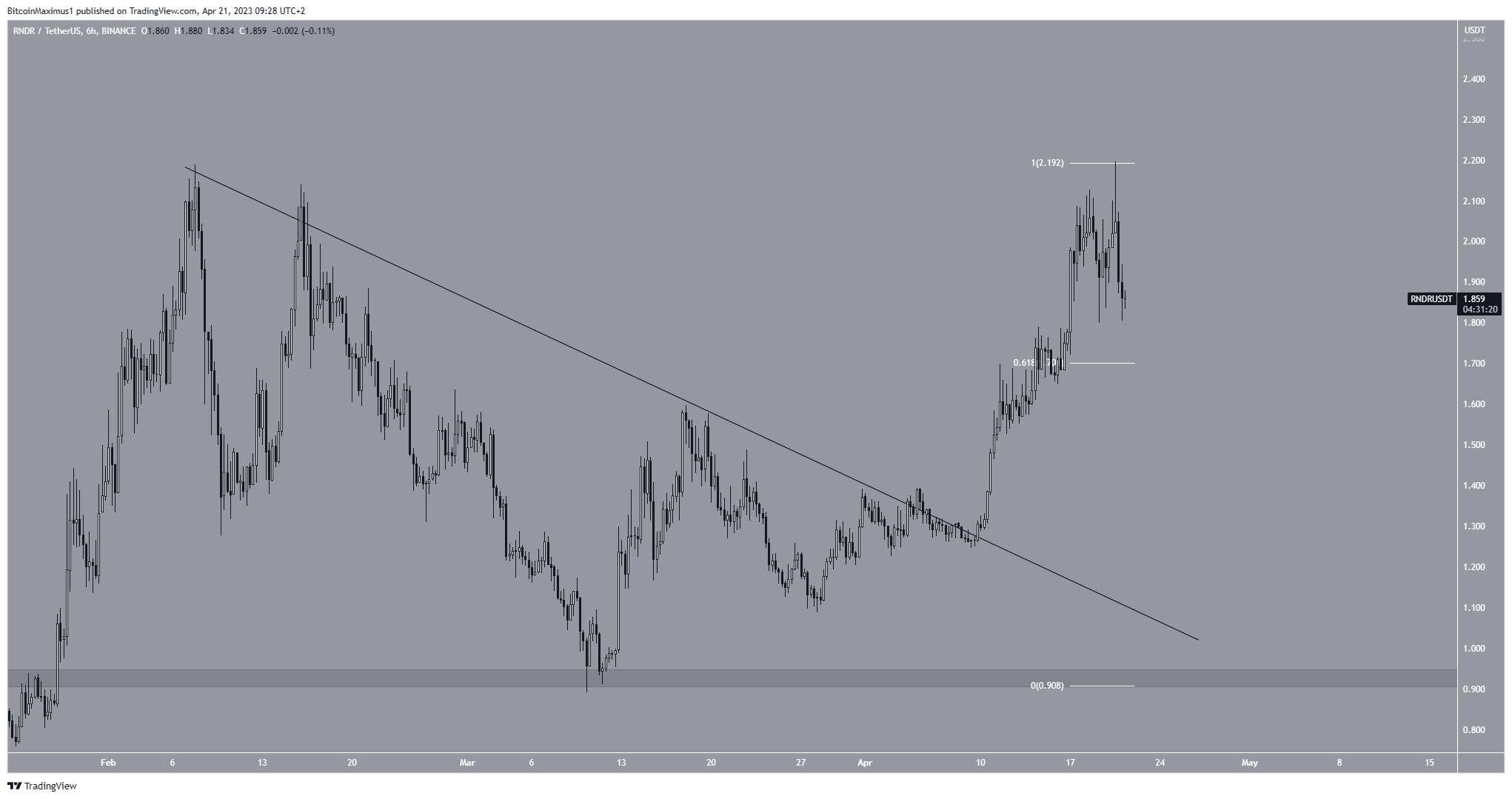 El precio de RNDR ha caído desde que alcanzó un máximo anual de 2.19 dólares el 20 de abril. El mismo día, creó una mecha superior larga.