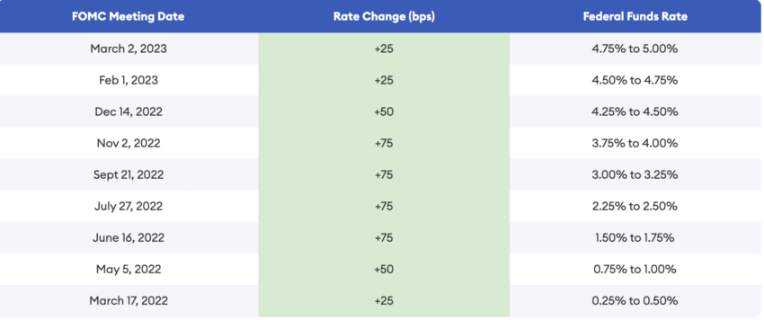 La Fed aumentó la tasa de interés en 0,25 puntos básicos (pb) en marzo. Después de nueve subidas agresivas de tipos de interés, el tipo actual se sitúa en el 4,75-5%.