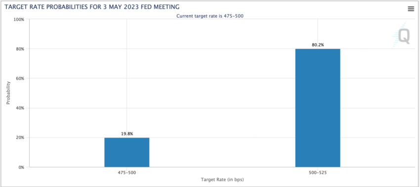Según CME Group, existe una probabilidad del 80,2% de una subida de tipos de interés de 25 pb en mayo.