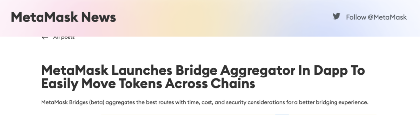 MetaMask anunció el miércoles 9 en sus redes sociales y en el blog oficial y el lanzamiento de la fase beta de un agregador entre cadenas para usuarios que quieran mover sus criptomonedas en diferentes blockchains. Puede acceder a la herramienta a través de su monedero dApp.