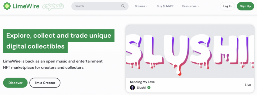 En uno de los 15 escenarios, LimeWire presentará artistas de su elección. Limewire era una antigua plataforma de intercambio de archivos entre pares que se usaba para compartir música pirateada entre amigos. Ahora se ha relanzado como un marketplace NFT.