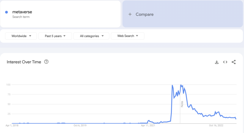 A pesar de la explosión de interés, el interés del público en general se ha desvanecido, según Google Trends. Después de alcanzar su punto máximo entre octubre de 2021, el momento del cambio de marca de Facebook, y enero de 2022, cuando Paris Hilton mostró su costoso NFT, el interés cayó aproximadamente 85%.