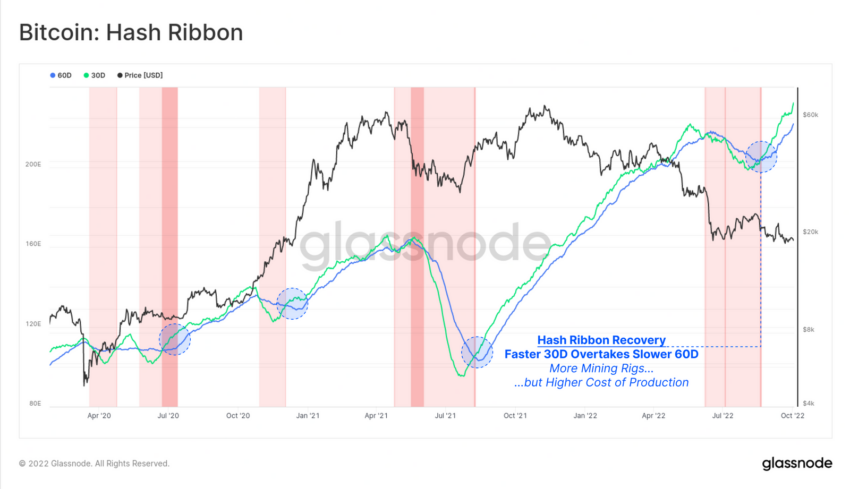 En el gráfico a continuación, podemos ver que el Hash Ribbon más lento y a largo plazo de Bitcoin fue nuevamente superada por la cinta más rápida, lo que indica mejores condiciones de minería a fines de agosto.