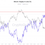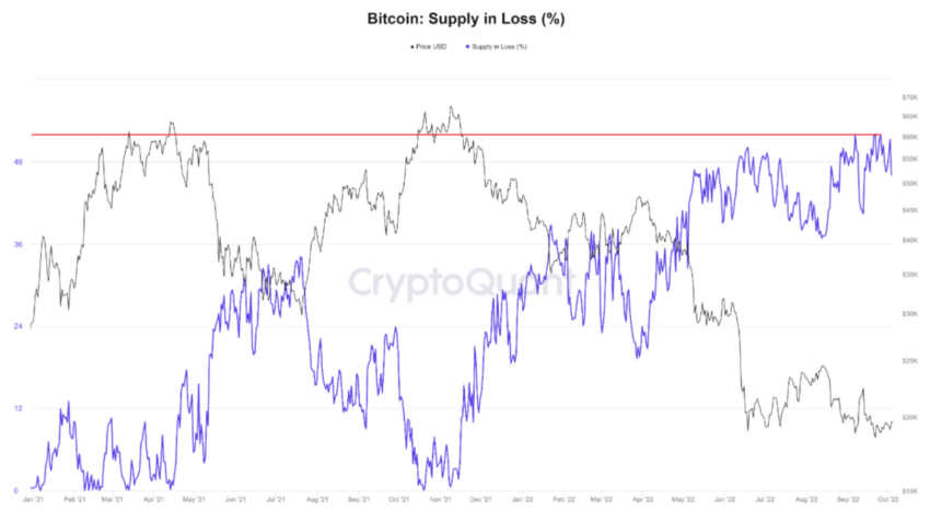 Los datos de CryptoQuant muestran que los precios mínimos durante los ciclos anteriores normalmente ocurren cuando el porcentaje de suministro en pérdida alcanza el 50% o más.