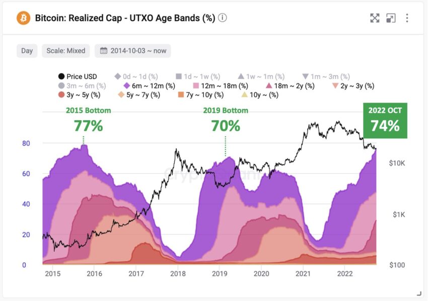 Además del hashrate, los niveles de acumulación de Bitcoin también alcanzaron un máximo de 7 años. Los datos de CryptoQuant muestran que los BTC de 6 meses o más ahora representan el 74% del límite realizado.