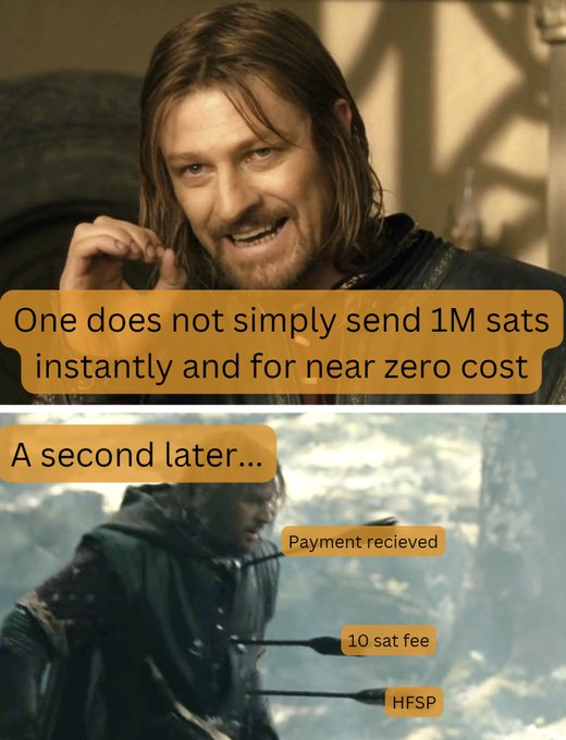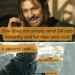 Este meme fue creado por el usuario @ShireHODL. En él, destaca la gran velocidad para ejecutar transacciones de la Lightning Network, además de las tarifas casi inexistentes que se deben pagar.