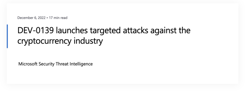 El equipo de inteligencia de amenazas de seguridad de Microsoft destacó un ataque dirigido a las nuevas empresas de criptomonedas. En un informe fechado el 6 de diciembre, el equipo investigó a un actor de amenazas llamado “DEV-0139”.