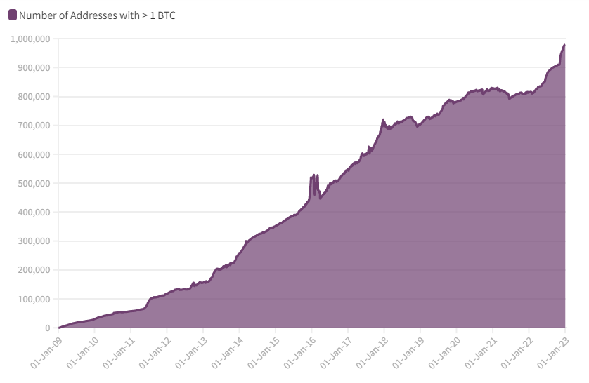 La caída del precio de Bitcoin también significa que hay más “monederos completos” (o direcciones que tienen al menos 1 BTC) que nunca. A principios de año había más de 814,000 direcciones con 1 BTC o más. A finales de año, había crecido 20% a 978,000. Este número también refleja el aumento general en la propiedad de BTC.