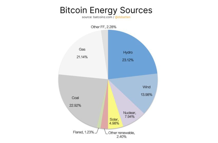 Daniel Batten, un investigador de la industria cripto, compartió ideas de que, al tener en cuenta la minería fuera de la red, la principal fuente de energía para la minería de Bitcoin es la energía hidroeléctrica. Esta cifra se sitúa en el 23%.