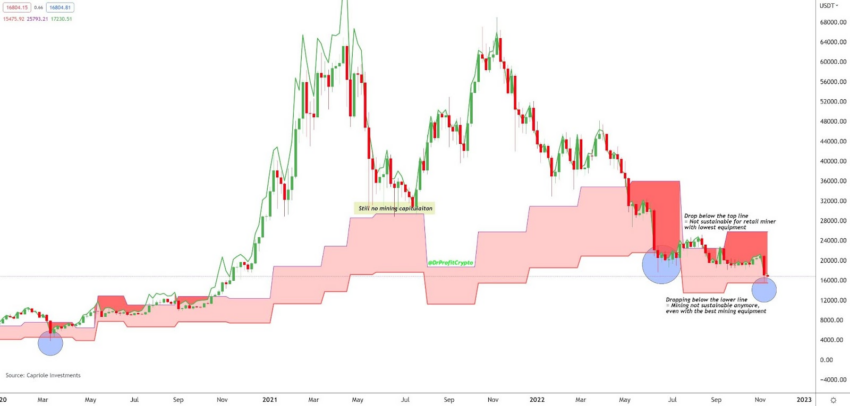 En el gráfico a continuación, podemos ver que una caída por debajo del extremo superior del rango hace que los mineros minoristas de Bitcoin con el equipo más débil capitulen.