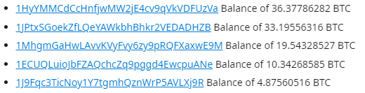 Saldos de las 5 direcciones atribuidas a QuadrigaCX (al 13 de febrero de 2019). Fuente: Reddit