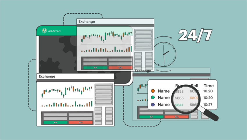 El software de trading algorítmico ArbiSmart está conectado a casi 40 exchanges que monitorea y escanea 24/7 en busca de diferencias de precios. El sistema automatizado puede ejecutar cientos de transacciones simultáneamente, explotando múltiples discrepancias a la vez. Compra el criptoactivo al precio más bajo disponible, después lo vende al precio más alto disponible para obtener una ganancia, antes de que la diferencia de precio temporal pueda resolverse por sí sola.