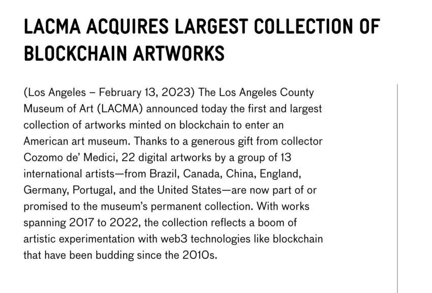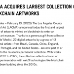 LACMA señaló: “Con obras que abarcan desde 2017 hasta 2022, la colección refleja un auge de la experimentación artística con tecnologías Web 3.0 como blockchain que ha estado en ciernes desde la década de 2010″.