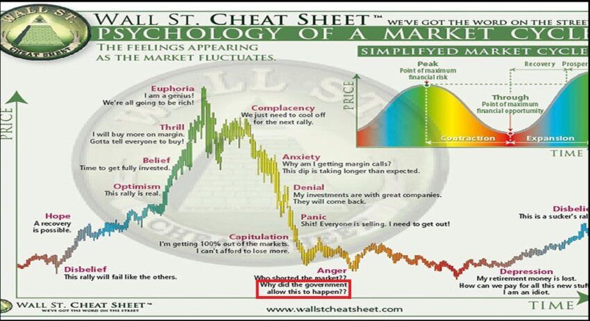Sim embargo, según el sentimiento del mercado actual podría ser el momento ideal ya que según el diagrama clásico de Wall Street sobre los ciclos psicológicos el inversor podría discernir que el mercado de las criptomonedas se encuentra entre la etapa de la ira y la depresión, uno de los momentos perfectos para comenzar a entrar en un mercado ya que después comenzaría de nuevo el proceso al alza.