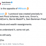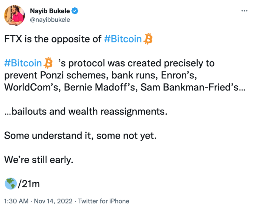 Respecto SBF, Bukele quiso recalcar a voz abierta para todos los públicos que los hechos fraudulentos ocurridos en la última semana eran actos de una persona o grupo de personas, no de las criptomonedas en sí. El presidente definió el caso de FTX como un “esquema Ponzi” y lo comparó con varios casos de corrupción anteriores como los rescates bancarios del 2008, subrayando que “FTX es lo contrario a bitcoin” en alusión a las críticas abiertas contra las criptomonedas derivadas del caso.
