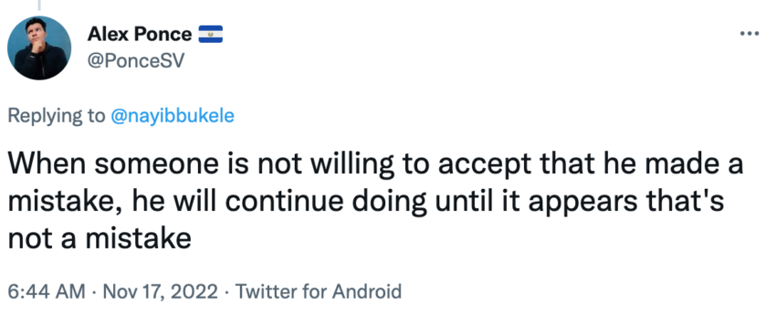 Para algunos, la continuación de la compra de bitcoin por parte de Bukele es un signo claro de un síndrome de negación ante el posible error de haber comprado bitcoin con fondos públicos como citó el salvadoreño Alex Ponce, amante de las ciencias políticas: