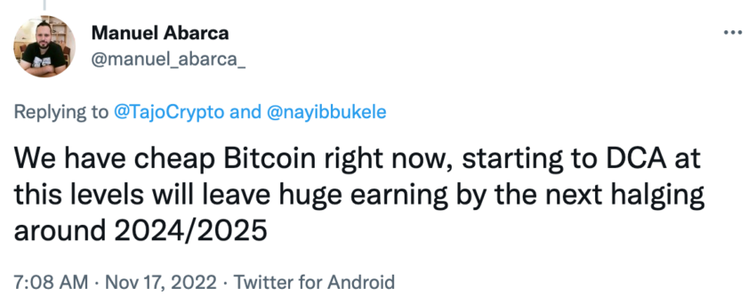 Otro salvadoreño, el desarrollador Manuel Albarca, resaltó un aspecto trascendental para cualquier inversor de bitcoin, el siguiente Halving de Bitcoin ocurrirá en la primavera del 2024 entre marzo y abril. Normalmente el año previo al Halving es cuando el precio de BTC comienza su ascenso.