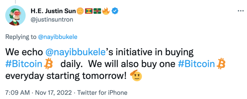 Justin Sun, fundador de Tron, se sumó rápidamente al nuevo plan de DCA del presidente de El Salvador como muestra de apoyo. Al igual que el Proof-of-Reserve de Changpeng Zhao, CEO de Binance, parece haberse convertido en una nueva tendencia entre los exchanges de criptomonedas, es posible que el comienzo de una compra escalonada de bitcoin podría extenderse entre varios actores de la industria cripto. BeInCrypto ha preguntado a ambos a qué presenten datos on-chain o pruebas claras de las compras para que no se quede en palabras, sino en hechos.