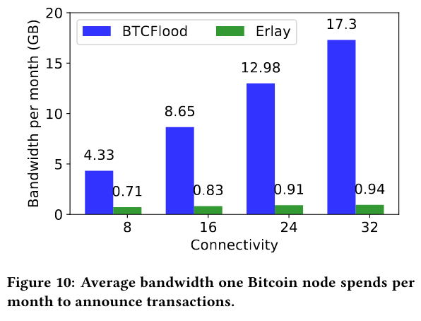 En su investigación, concluyeron que Erlay podía reducir el consumo de ancho de banda en 40% y mantener este uso estable, al igual que los costos por transmitir transacciones. En la siguiente imagen, se puede apreciar como un nodo de Bitcoin tiende a consumir más ancho de banda cada mes, mientras que con Erlay este indicador se mantiene mas o menos fijo.