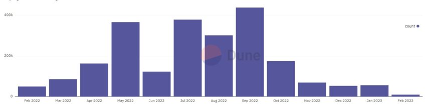 Los datos de Dune Analytics muestran que los nuevos registros y direcciones están en su nivel más bajo, cayendo en los últimos meses. Actualmente hay alrededor de 2,7 millones de nombres ENS activos en total.