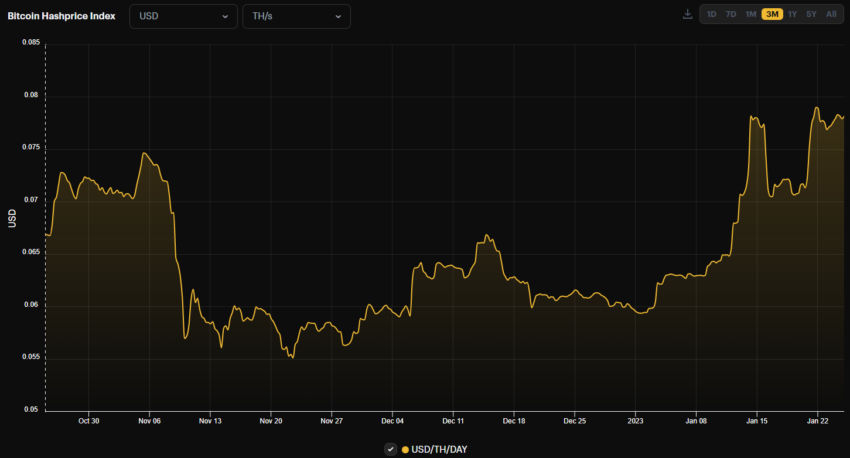 La rentabilidad minera o el “precio del hash“ se ha desprendido de su fondo de diciembre. Desde principios de año, el precio del hash ha subido 32% hasta los 0,078 dólares, según HashRate Index . La métrica se mide en dólares por día por terahash por segundo ($/d/TH/s).