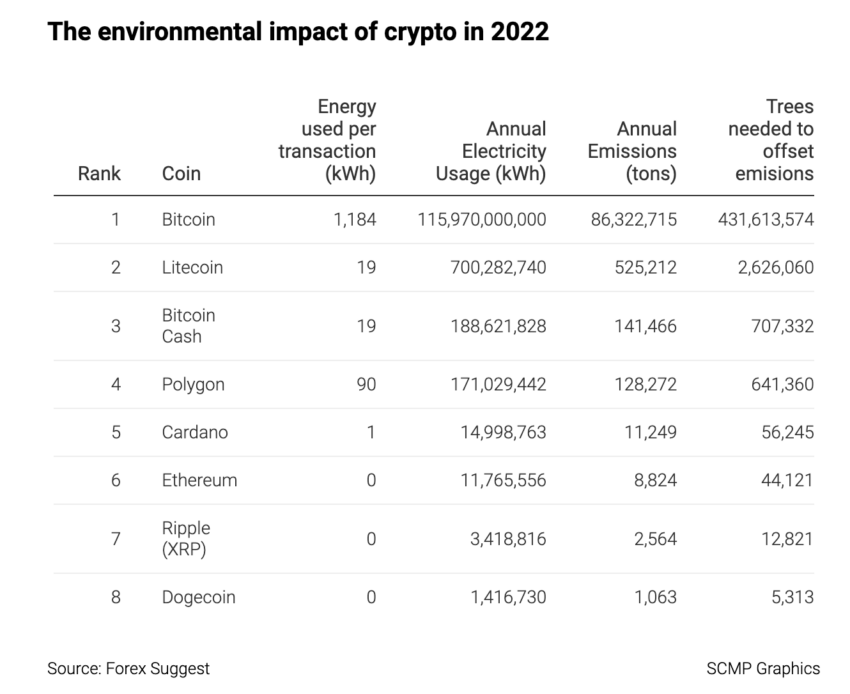 Si atendemos al cierre de 2022, vemos como Bitcoin encabeza la lista de criptomonedas más contaminantes con una enorme ventaja frente a la nº2, que sería Litecoin. Los datos que aparecen de Ethereum corresponderían hasta la puesta en marcha de The Merge, el proceso por el cual ETH dejó el protocolo Proof of Work y pasó a Proof of Stake, reduciendo así en un 99% su consumo energético.