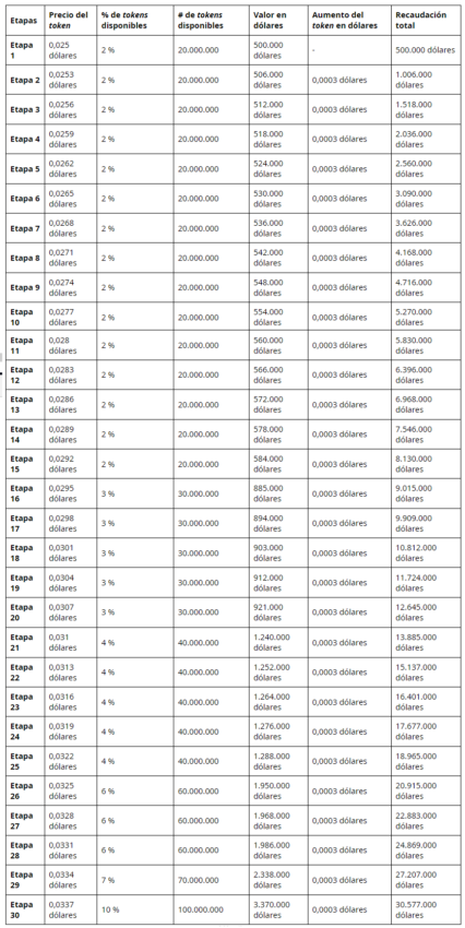 Para graficar de la mejor manera el evento de preventa de WSM, vamos con el recuadro de precios del token, etapas y porcentaje de incremento de precios: