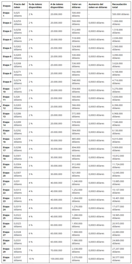 La preventa de Wall Street Memes está dividida en 30 etapas, cada una con un hito de recaudación predeterminado y con un aumento en el valor del token asignado por la estrategia deflacionaria impuesta desde el día uno de la ICO.