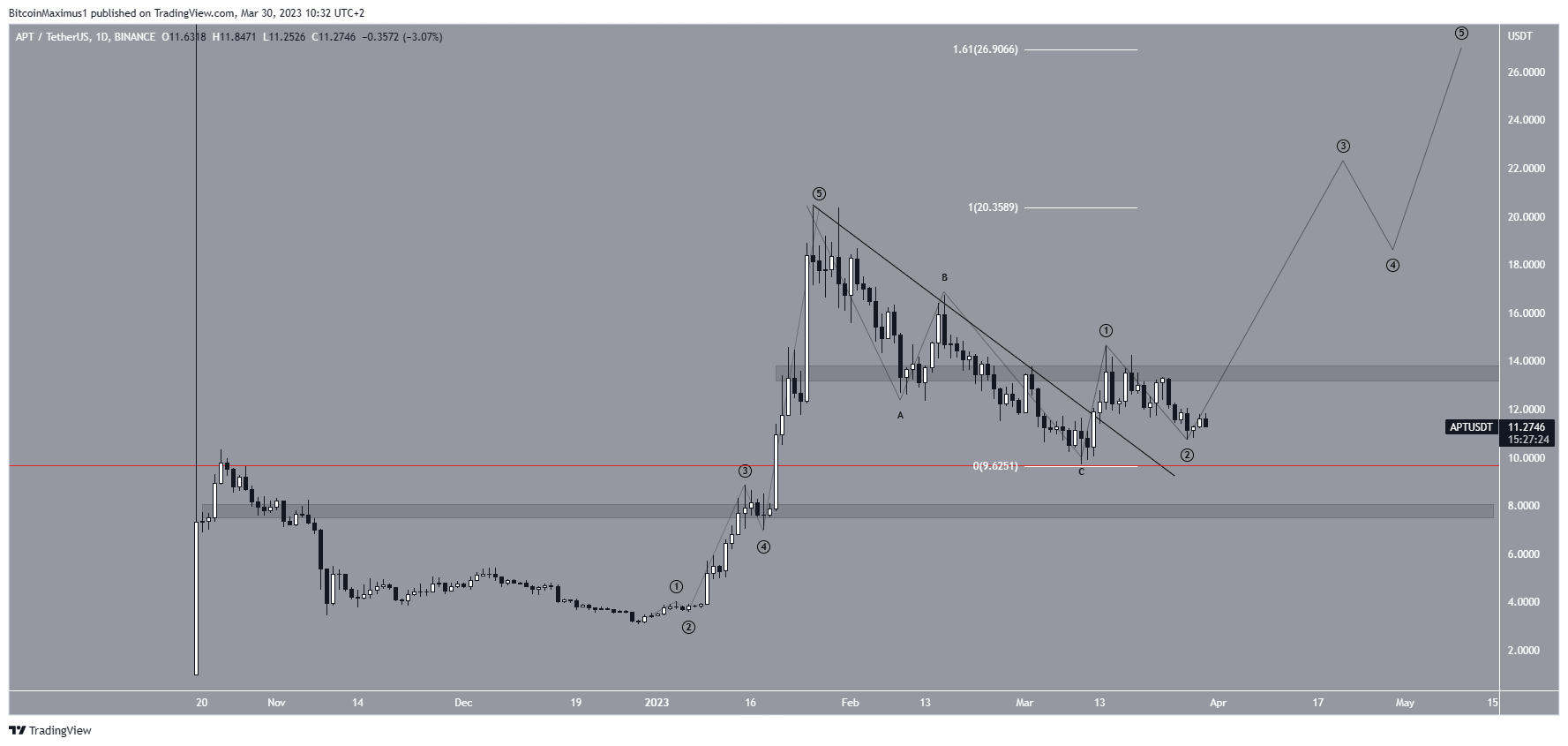 El movimiento desde el 10 de marzo parece el comienzo de un nuevo movimiento alcista. En primer lugar, el precio de APT rebotó exactamente en el nivel de soporte de retroceso de Fibonacci de 0,618 del movimiento ascendente anterior, que es una señal común que marca el final de una corrección.