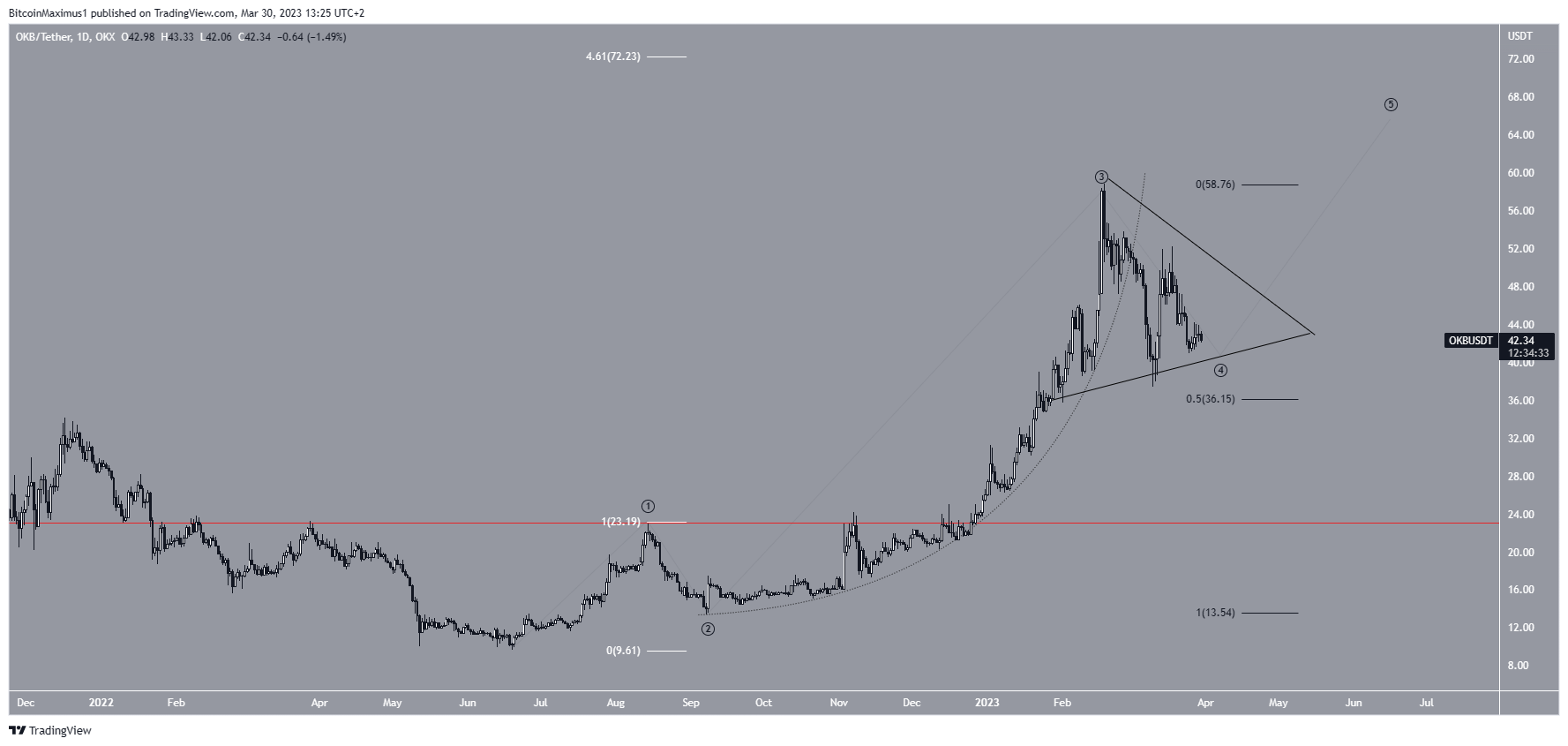 El precio de OKB aumentó junto con una línea de soporte ascendente parabólica desde septiembre de 2022. El aumento condujo a un nuevo precio máximo histórico de 58.85 dólares el 18 de febrero.