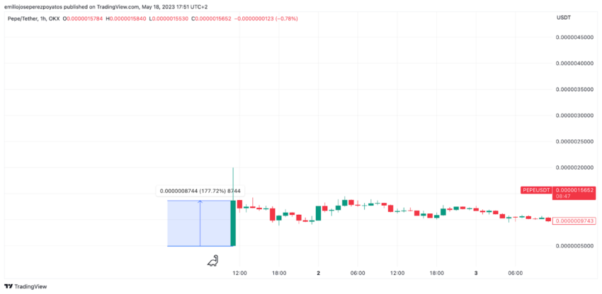 El arranque de otros memecoins recientes nos puede servir como guía de lo que podemos esperar con LHINU. Por ejemplo, cuando PEPE comenzó a negociarse en OKX, logró revalorizarse un +177% sólo en una hora: