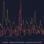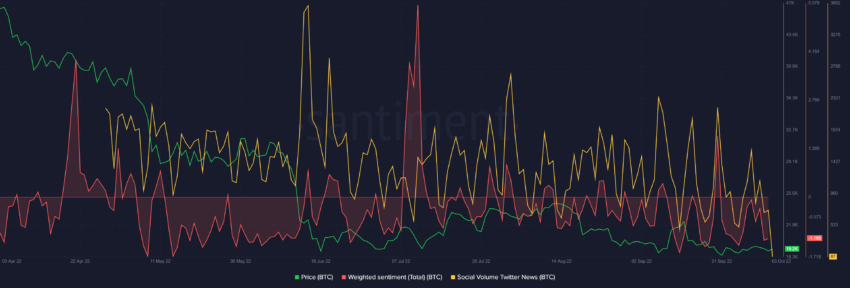 Los datos sociales de Santiment mostraron un puntaje de sentimiento de BTC ponderado de -1.185, mientras que la métrica de noticias de Twitter de volumen social cayó a sus niveles más bajos desde abril de 2022.