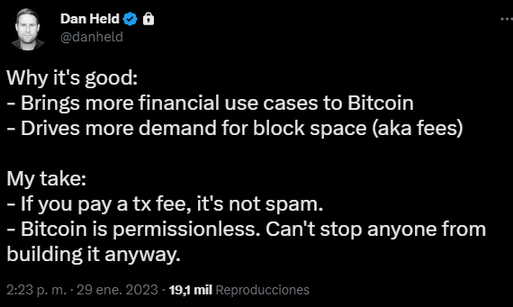 En esta misma línea, Dan Held también expresó que la capacidad que brinda Ordinals con respecto a los NFT en Bitcoin, es algo bueno para la red.