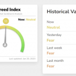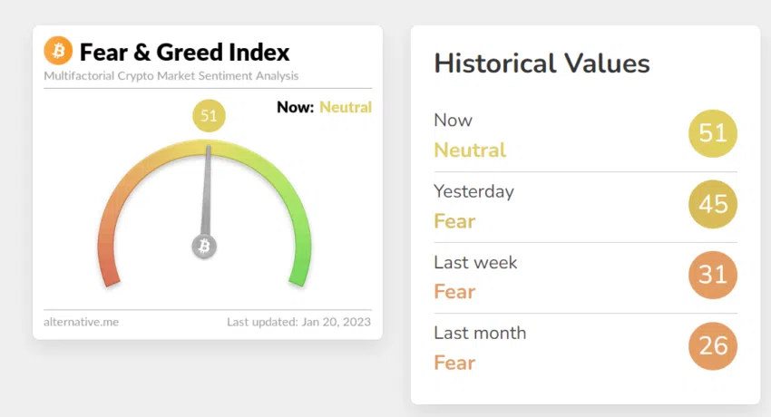 El índice Crypto Fear and Greed ha pasado del miedo a la neutralidad entre el 19 y el 20 de enero de 2023, lo que implica que la aprensión del mercado se está disipando lentamente.