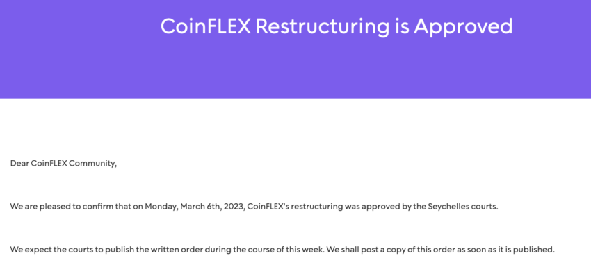 Un tribunal de Seychelles ha aprobado el plan de reestructuración presentado por la plataforma de derivados cripto CoinFLEX, con sede en Hong Kong, según informó la empresa en comunicado emitido el 07 de marzo.