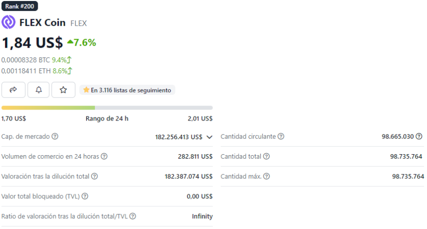 Al momento de la publicación, el token FLEX se estabilizó en 1.84 dólares, según los datos de CoinGecko.