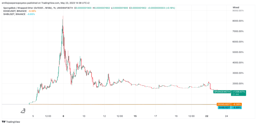 Detalle de cotización de SPONGE desde origen, comparación con DOGE y SHIB / Fuente: TradingView