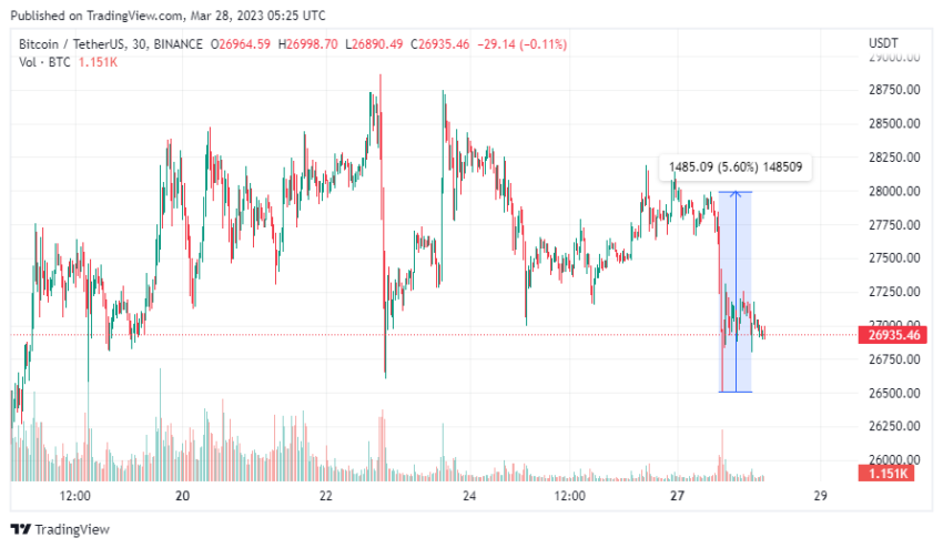 Por el momento, Bitcoin perdió más del 5%de su valor, según CoinMarketCap. Posteriormente, el precio de Bitcoin alcanzó un mínimo local a 26,606 fólares.