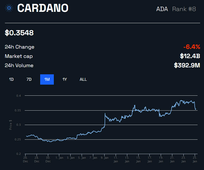 ADA alcanzó un máximo de once semanas de 0.384 dólares el 22 de enero, pero hoy ha caído junto al resto del criptomercado. Actualmente cotiza en 0.354 dólares tras caer fuertemente en las últimas seis horas.